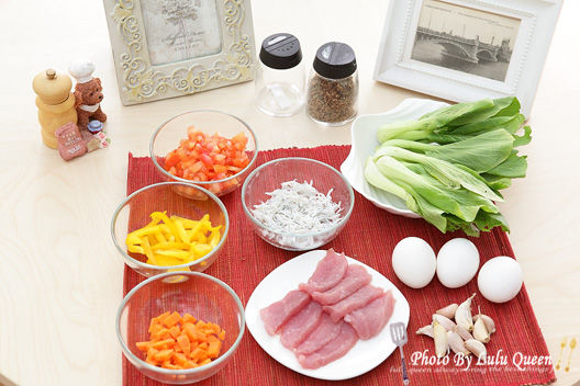 炒雜菜材料:蒜,青江菜,黃椒,胡蘿蔔,吻仔魚